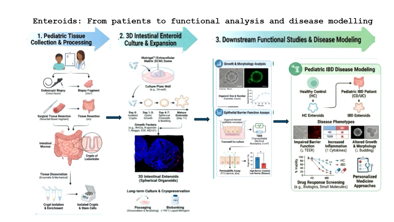 We employ a pediatric intestinal organoid biobank derived from biopsies and surgical tissues collected from children under five years of age. These patient-derived enteroids are systematically characterized and provide a robust human platform for modeling gastrointestinal disease. Our research focuses on very early onset inflammatory bowel disease (VEO-IBD), utilizing intestinal organoids to examine disease-associated changes in epithelial growth, morphology, and barrier function. This methodology facilitates functional, disease-relevant investigation of epithelial defects within a controlled human system. We explore how inflammatory stimuli affect epithelial organization, differentiation, and barrier integrity. By integrating biobanking, phenotypic characterization, and functional assays, our intestinal organoid systems offer reproducible platforms for studying inflammatory and infectious intestinal diseases and for evaluating therapeutic strategies.