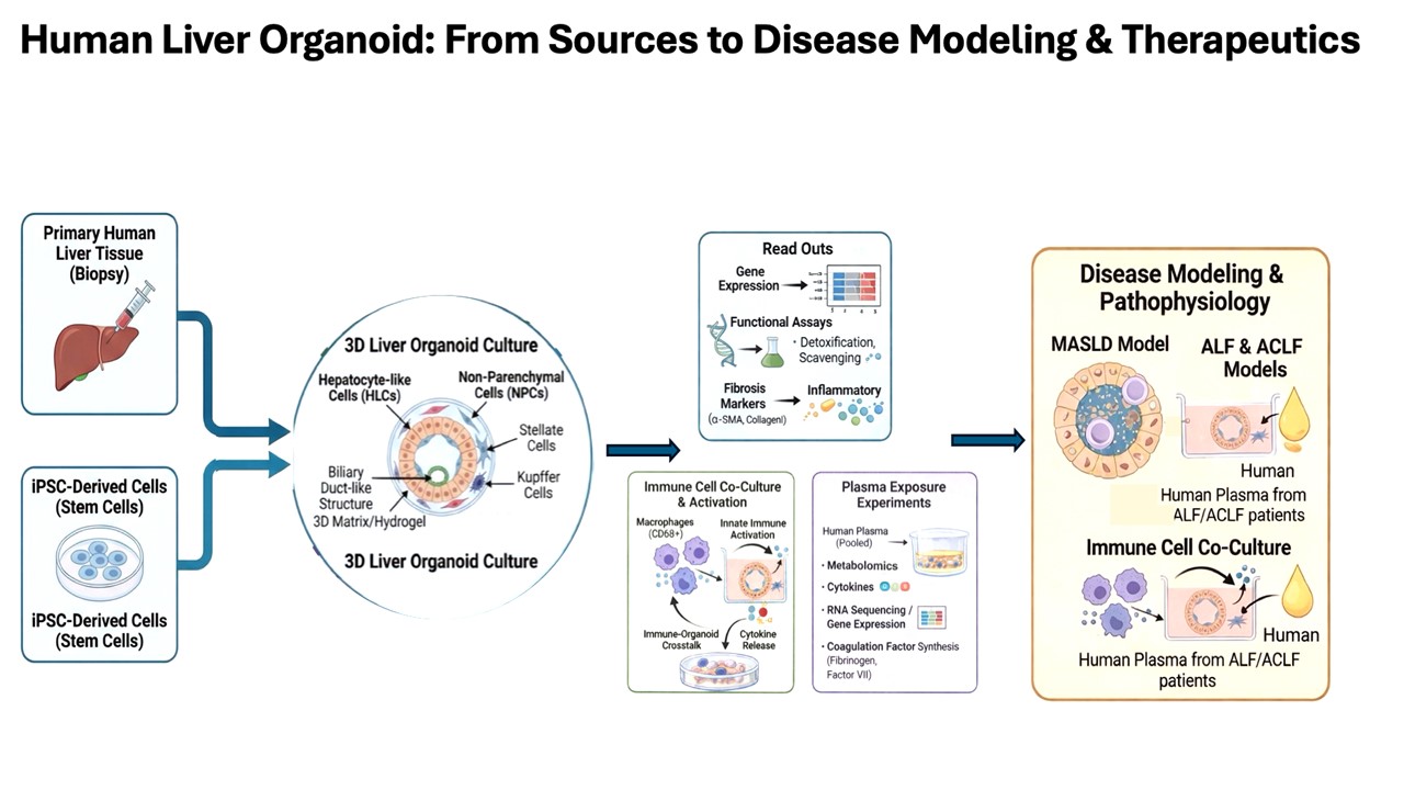 To enhance genetic and phenotypic diversity, we are developing induced pluripotent stem cell (iPSC)-derived liver organoid systems. These models will complement organoids derived from primary tissue and facilitate scalable, patient-specific disease modeling. Additionally, we are constructing co-culture platforms, particularly with macrophages, to investigate innate immune activation and inflammatory liver injury in MASLD and alcohol-related liver disease.